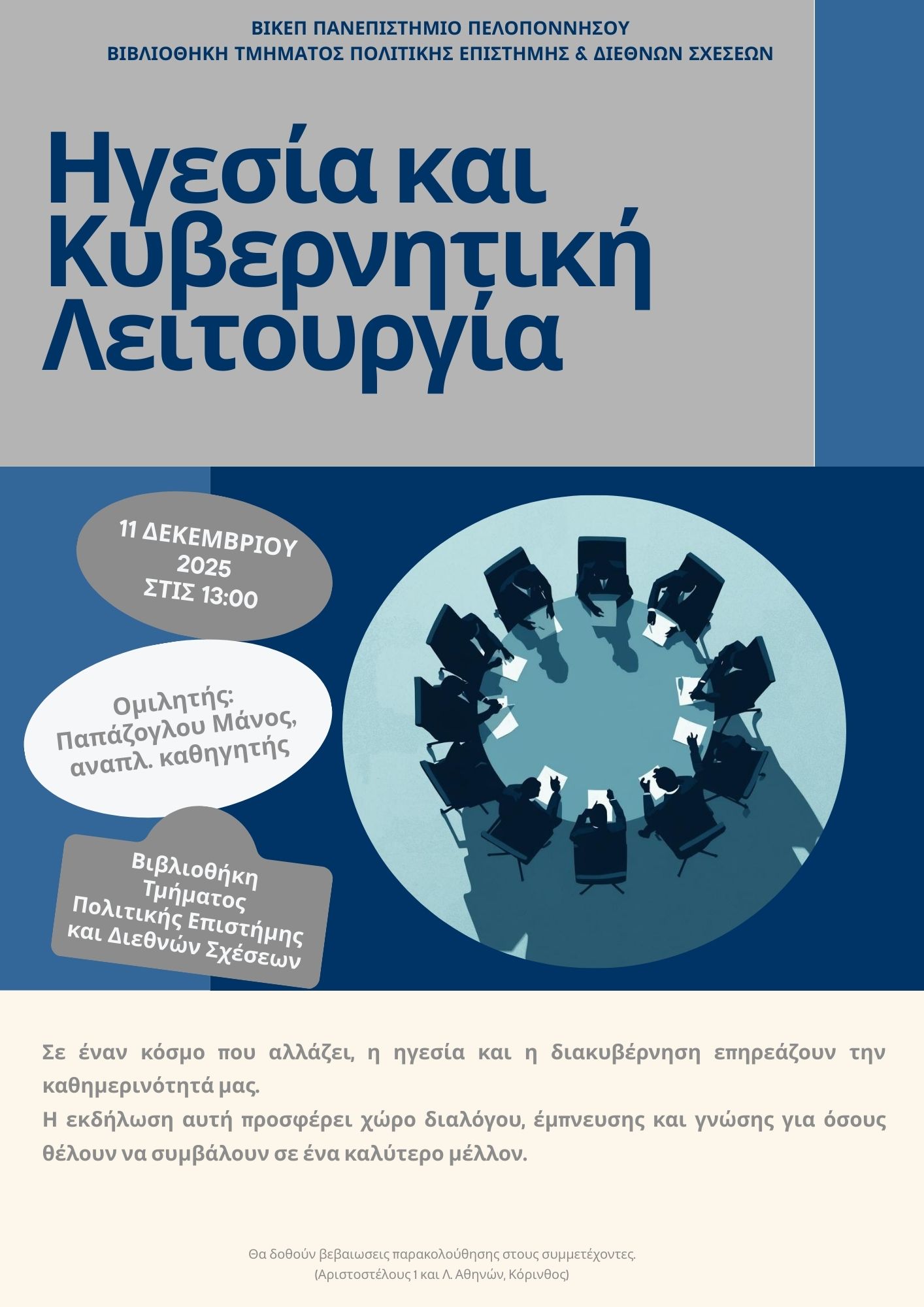 Διάλεξη (11/12/25) του Αν. Καθ. κ. Ε. Παπάζογλου στη Βιβλιοθήκη: «Ηγεσία και Κυβερνητική Λειτουργία»